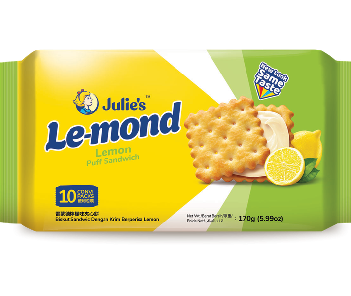 – Julie’s Le Mond Sandwich Lemon Cream offers a delightful lemon-flavored cream sandwiched between crispy puff biscuits. Perfect for on-the-go snacking, these treats provide a refreshing burst of citrus flavor in every bite.